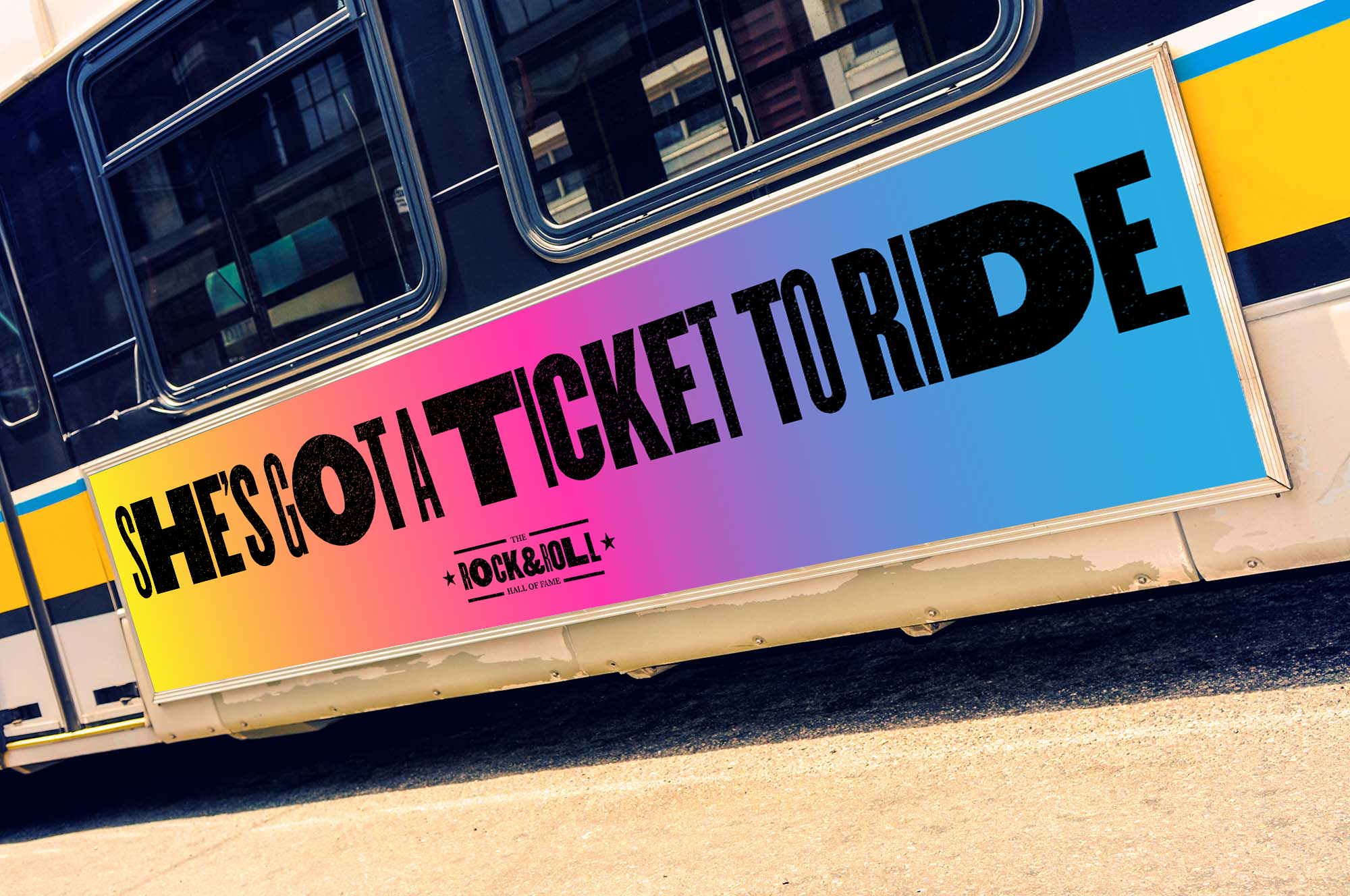 Taken from the lyrics of Elvis Presley’s 1957 #1 hit single Jailhouse Rock, the campaign was titled “Let’s Rock.” Reflecting the attitude, energy and fearless spirit of Rock and Roll, the campaign combined bold typography, photography, and color for maximum emotional impact. Targeted towards music buffs, the campaign features well known and recognizable lyrics from iconic songs and artists currently in the Rock & Roll Hall of Fame.